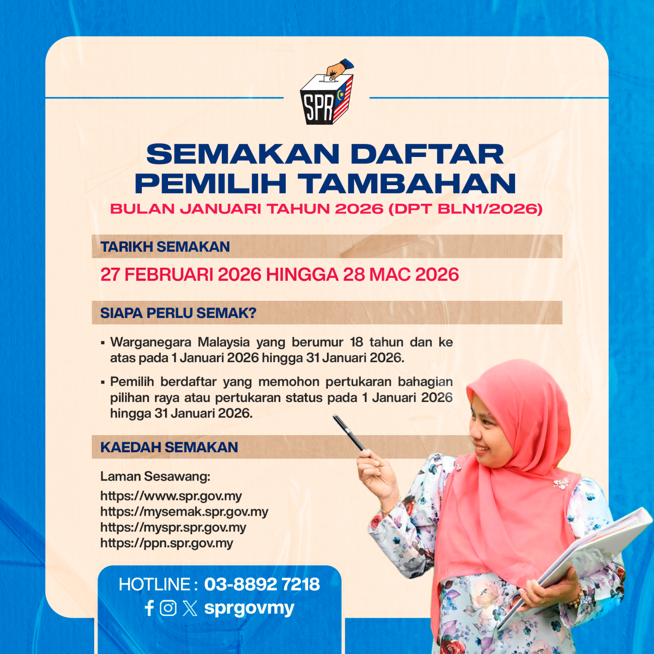 Anak Bukit, 27 Februari 2026 – Untuk makluman, Semakan Daftar Pemilih Tambahan Bulan Januari 2026 (DPT BLN 1/2026) boleh dibuat secara atas talian.