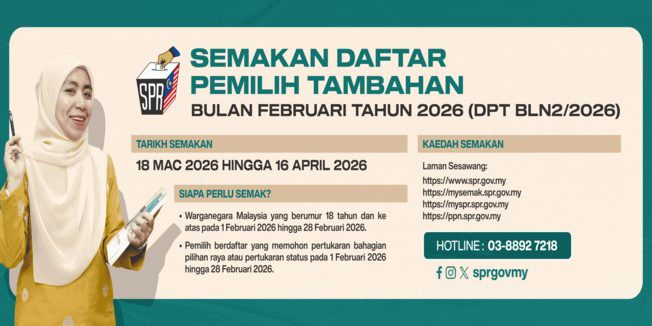 Adalah dimaklumkan bahawa, Kertas Pertimbangan SPR Bil. 7/2026 telah pun diedarkan pada 13 Mac 2026 dan Suruhanjaya Pilihan Raya Malaysia (SPR) telah bersetuju terhadap Cadangan Pemerakuan Daftar Pemilih Tambahan Bulan Februari Tahun 2026. Notis Pemerakuan Daftar Pemilih Tambahan Bulan Februari Tahun 2026 (DPT BLN2//2026) akan diwartakan pada 18 Mac 2026 (Rabu). Sehubungan dengan itu, selaras dengan pewartaan tersebut, DPT BLN2/2026 akan dibuka untuk semakan selama 30 hari mulai 18 Mac 2026 hingga 16 Mac 2026 di :-