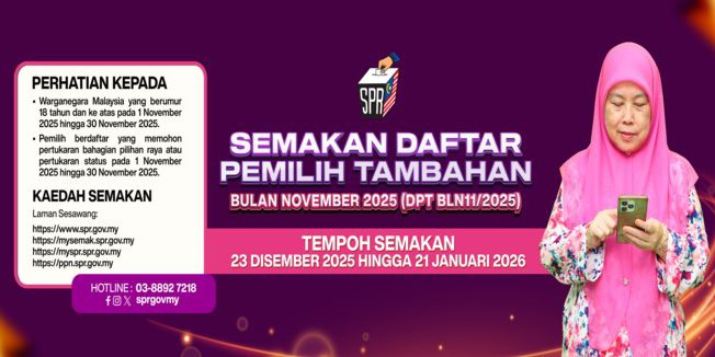 Adalah dimaklumkan bahawa, Kertas Pertimbangan SPR Bil. 30/2025 telah pun diedarkan pada 17 Disember 2025 dan Suruhanjaya Pilihan Raya Malaysia (SPR) telah bersetuju terhadap Cadangan Pemerakuan Daftar Pemilih Tambahan Bulan November Tahun 2025. Notis Pemerakuan Daftar Pemilih Tambahan Bulan November Tahun 2025 (DPT BLN11/2025) akan diwartakan pada 23 Disember 2025 (Selasa). Sehubungan dengan itu, selaras dengan pewartaan tersebut, DPT BLN11/2025 akan dibuka untuk semakan selama 30 hari mulai 23 Disember 2025 hingga 21 Januari 2026 di :-
