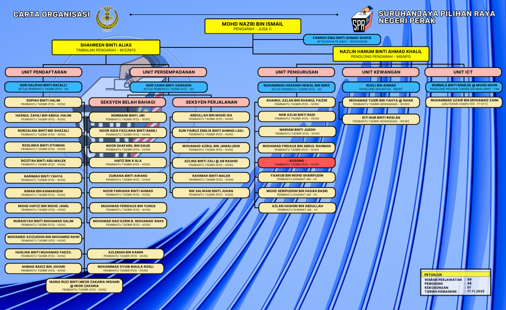 Carta Organisasi Pejabat Pilihan Raya Negeri Perak merangkumi 3 orang pegawai dan 46 orang kakitangan. Sila klik pada imej carta untuk paparan yang lebih besar.