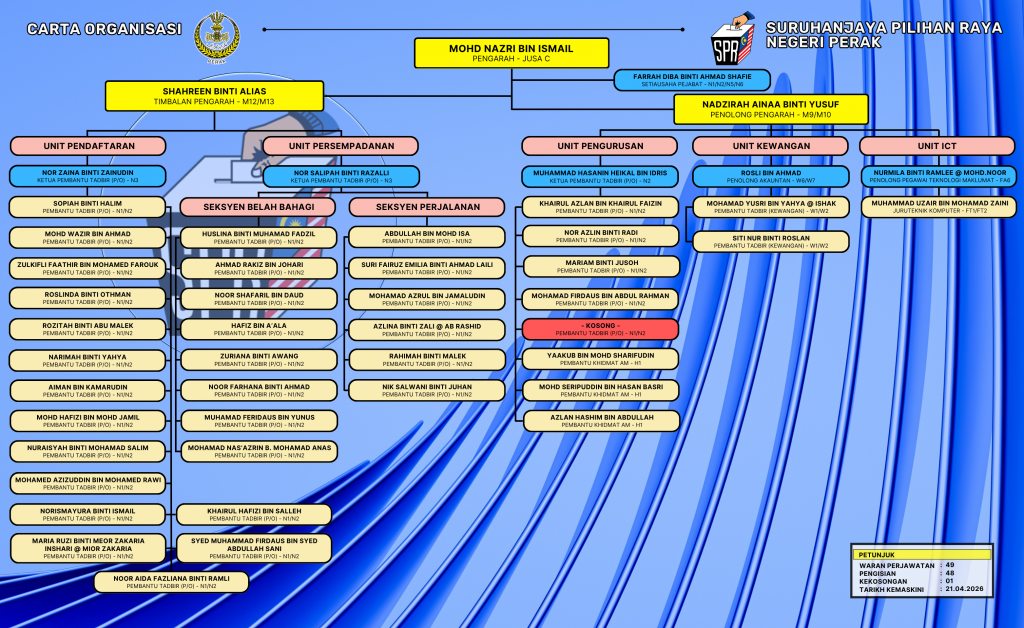 Carta Organisasi Pejabat Pilihan Raya Negeri Perak merangkumi 3 orang pegawai dan 46 orang kakitangan. Sila klik pada imej carta untuk paparan yang lebih besar.