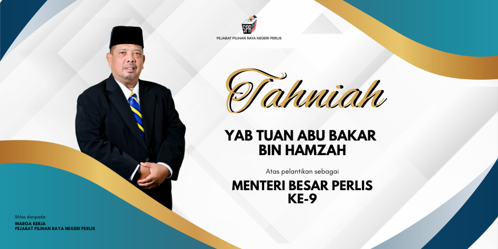 Pengarah dan seluruh warga kerja Pejabat Pilihan Raya Negeri Perlis mengucapkan tahniah kepada YAB Tuan Abu Bakar bin Hamzah atas pelantikan sebagai Menteri Besar Perlis yang Ke-9