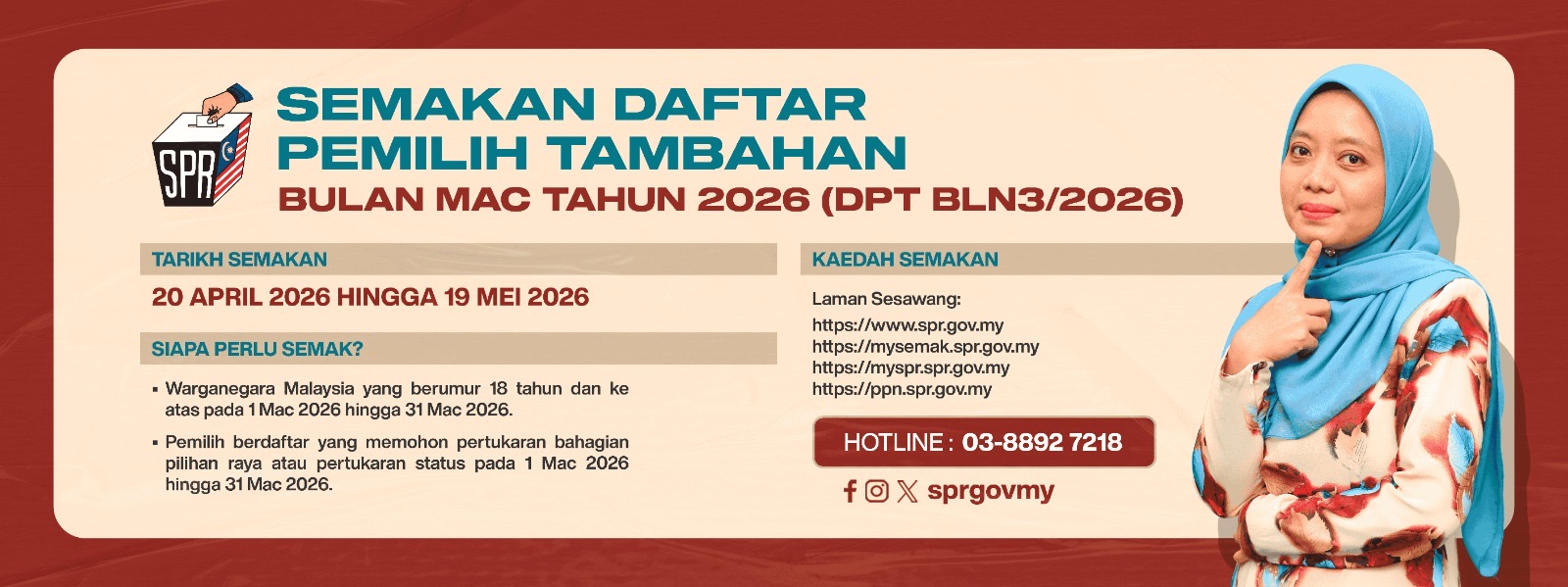 - Butiran lanjut bagi Semakan Daftar Pemilih Tambahan Bulan MAC 2026 sila klik disini